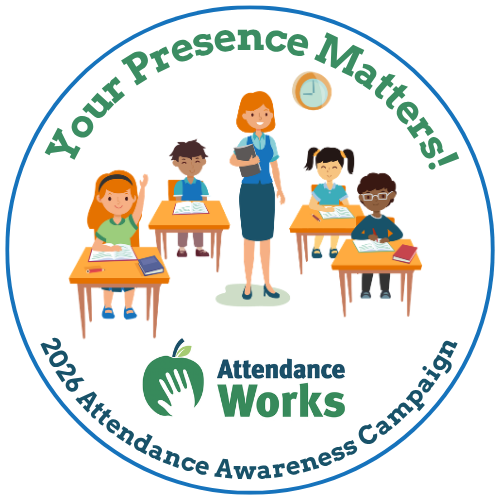 Click on the Attendance Works badge below, with the slogan Your Presence Matters! to display on your website, blog, e-mail signature and social media profile pictures to help spread the word about the Attendance Awareness Campaign 2026!